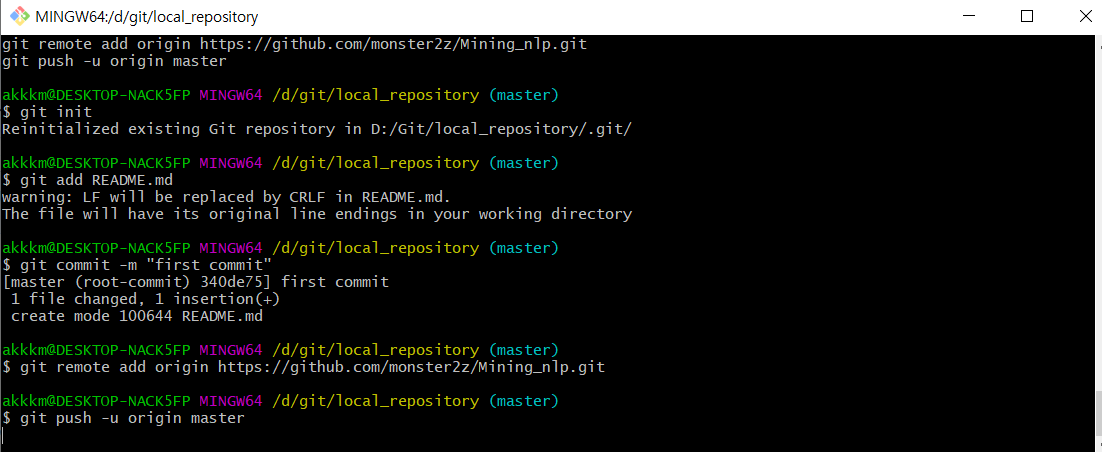 이제 최종 업로드만 남았다. 업로드는 push로 이루어진다.