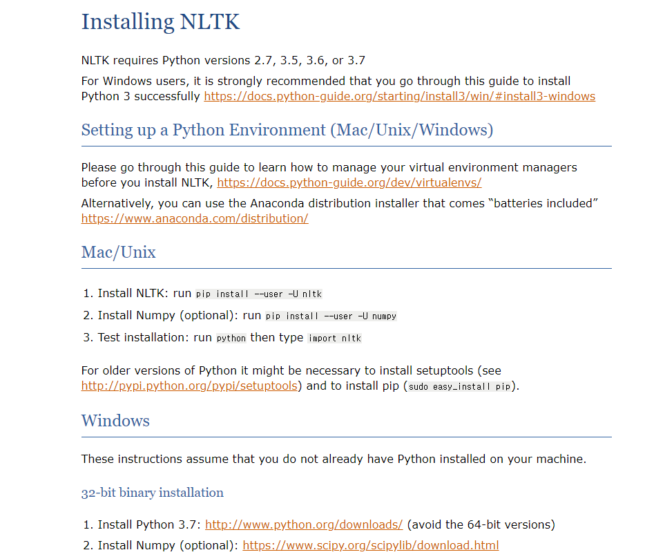 오른쪽 TOC(table of contents)의 Installing NLTK를 클릭하면,